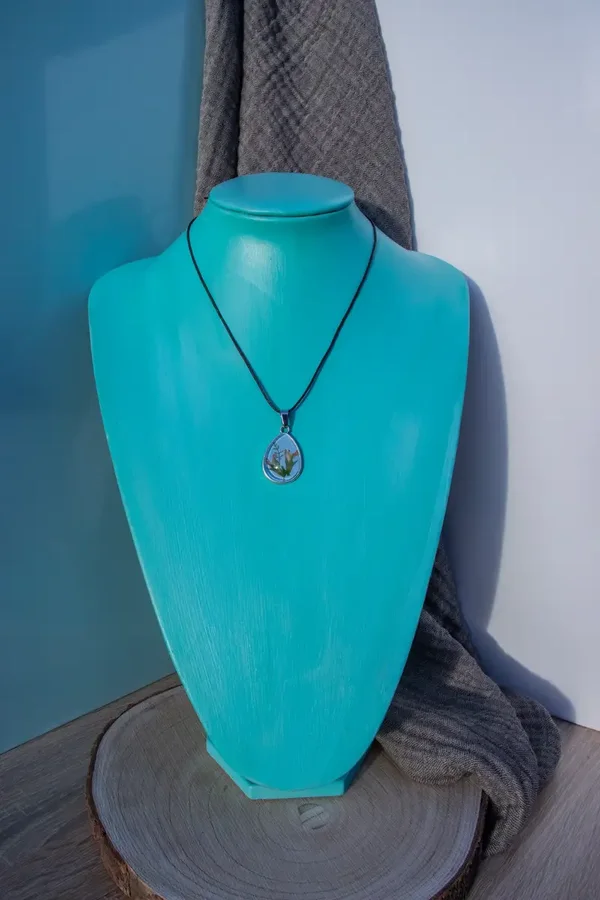 Dieser Anhänger aus Edelstahl beherbergt getrocknete Pflanzen, die mit einer gläsernen Kuppel bedeckt sind. Der Hintergrund wird mit Farbe bemalt.
