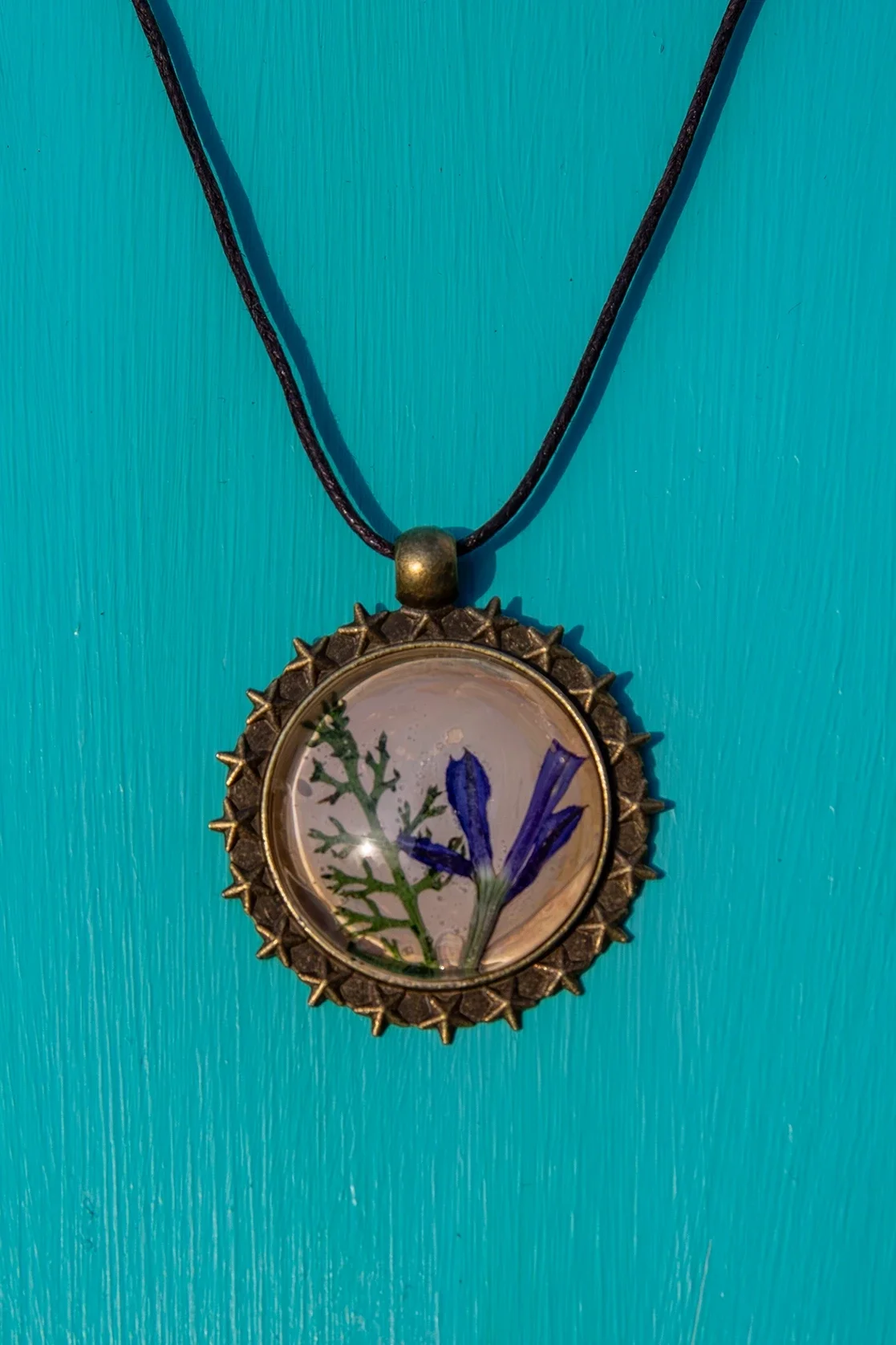 Dieser Anhänger aus Edelstahl beherbergt getrocknete Pflanzen, die mit einer gläsernen Kuppel bedeckt sind. Der Hintergrund wird mit Farbe bemalt.