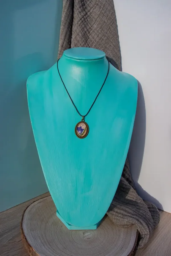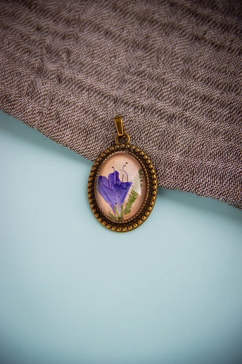 Dieser Anhänger aus Edelstahl beherbergt getrocknete Pflanzen, die mit einer gläsernen Kuppel bedeckt sind. Der Hintergrund wird mit Farbe bemalt.