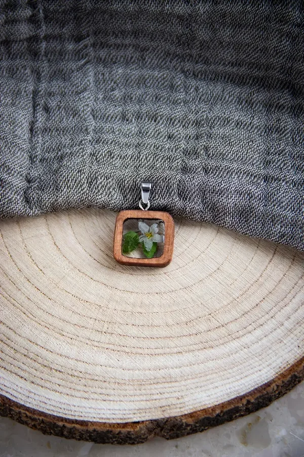 Verwendete Materialien: Lindenholz, UV Kunstharz, echte Pflanzen, Edelstahl