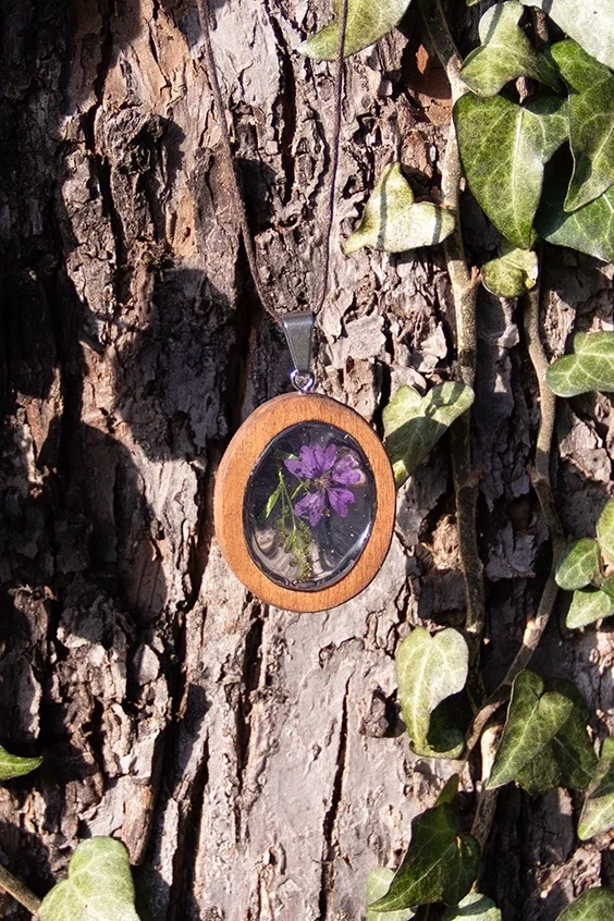 Dieser Anhänger hat einen handgefertigten Rahmen aus gefärbtem Lindenholz. Er wird dann mit Kunstharz ausgegossen, in dem echte getrocknete Pflanzen eingelassen sind. Anschließend werden die Edelstahlhaken hinein geschraubt.