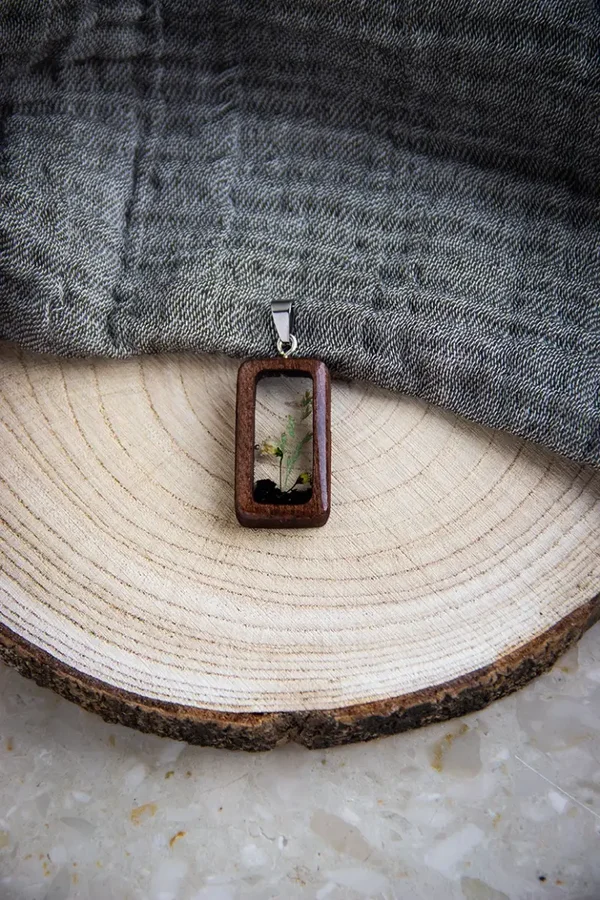 Dieser Anhänger hat einen handgefertigten Rahmen aus gefärbtem Lindenholz. Er wird dann mit Kunstharz ausgegossen, in dem echte getrocknete Pflanzen eingelassen sind. Anschließend werden die Edelstahlhaken hinein geschraubt.