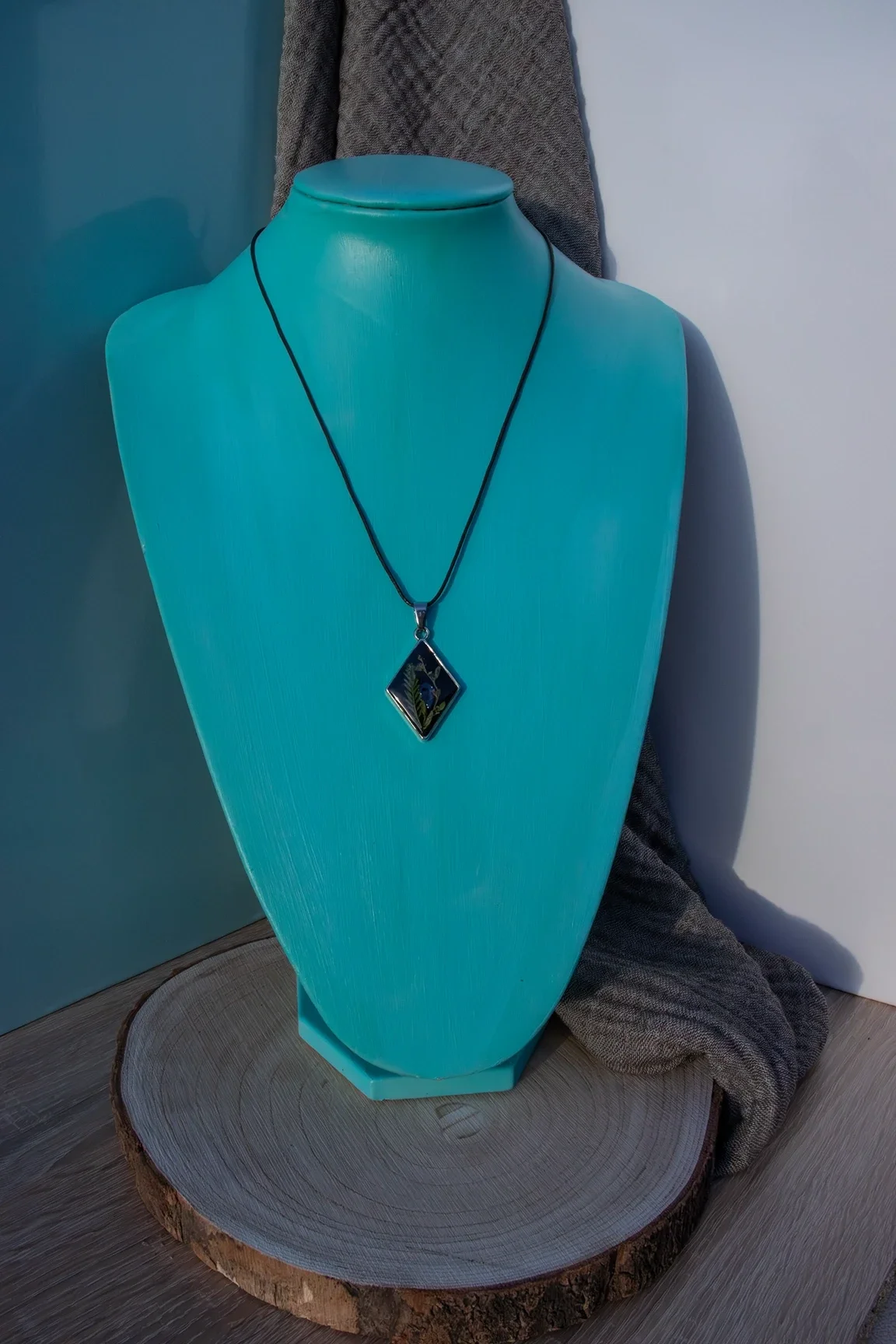 Dieser Anhänger hat einen Rahmen aus Edelstahl. Das Innere ist mit Kunstharz ausgegossen und echte getrocknete Pflanzen wurden darin eingelassen.