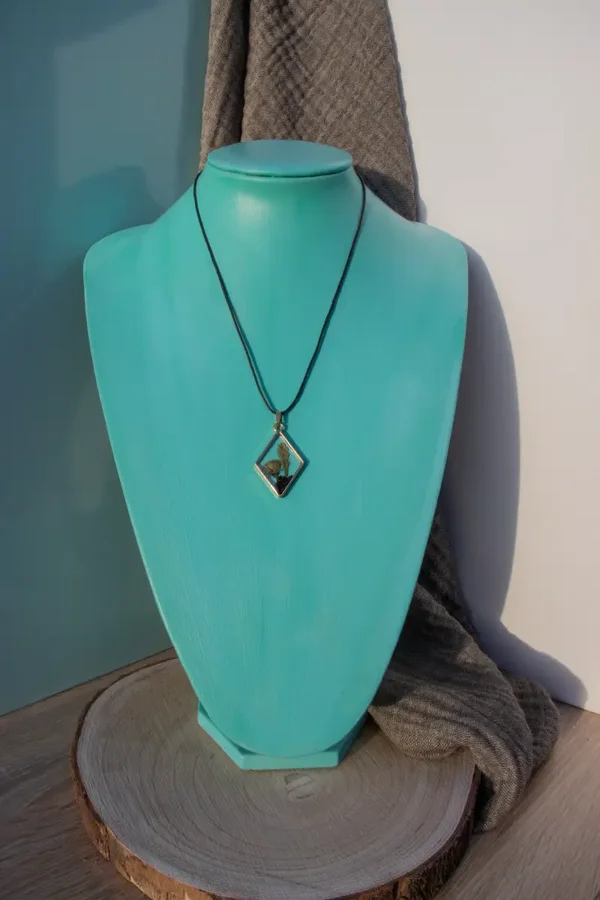 Dieser Anhänger hat einen Rahmen aus Edelstahl. Das Innere ist mit Kunstharz ausgegossen und echte getrocknete Pflanzen wurden darin eingelassen.