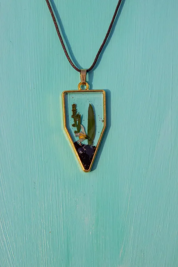 Dieser Anhänger hat einen Rahmen aus Edelstahl. Das Innere ist mit Kunstharz ausgegossen und echte getrocknete Pflanzen wurden darin eingelassen.