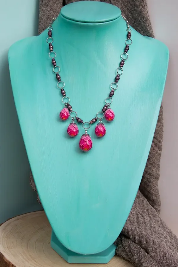 Collier aus Edelstahl mit handgemachten Anhängern aus Kunstharz.