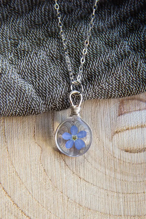 Dieser Anhänger wird aus versilbertem Kupferdraht Hand gebogen und sorgfältig mit Kunstharz ausgegossen, bevor die winzigen Blüten darin eingelassen werden.