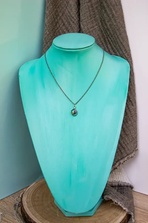 Dieser Anhänger wird aus versilbertem Kupferdraht Hand gebogen und sorgfältig mit Kunstharz ausgegossen, bevor die winzigen Blüten darin eingelassen werden.