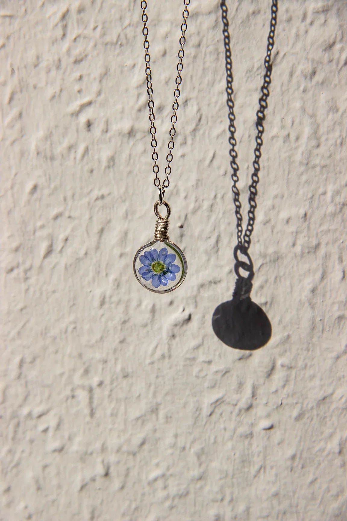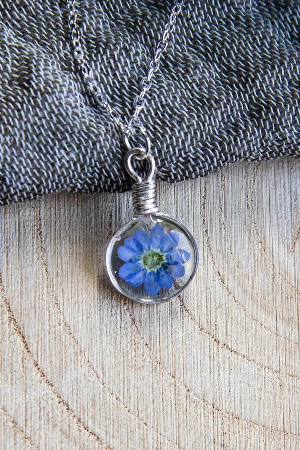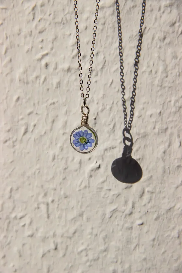 Dieser Anhänger wird aus versilbertem Kupferdraht Hand gebogen und sorgfältig mit Kunstharz ausgegossen, bevor die winzigen Blüten darin eingelassen werden.