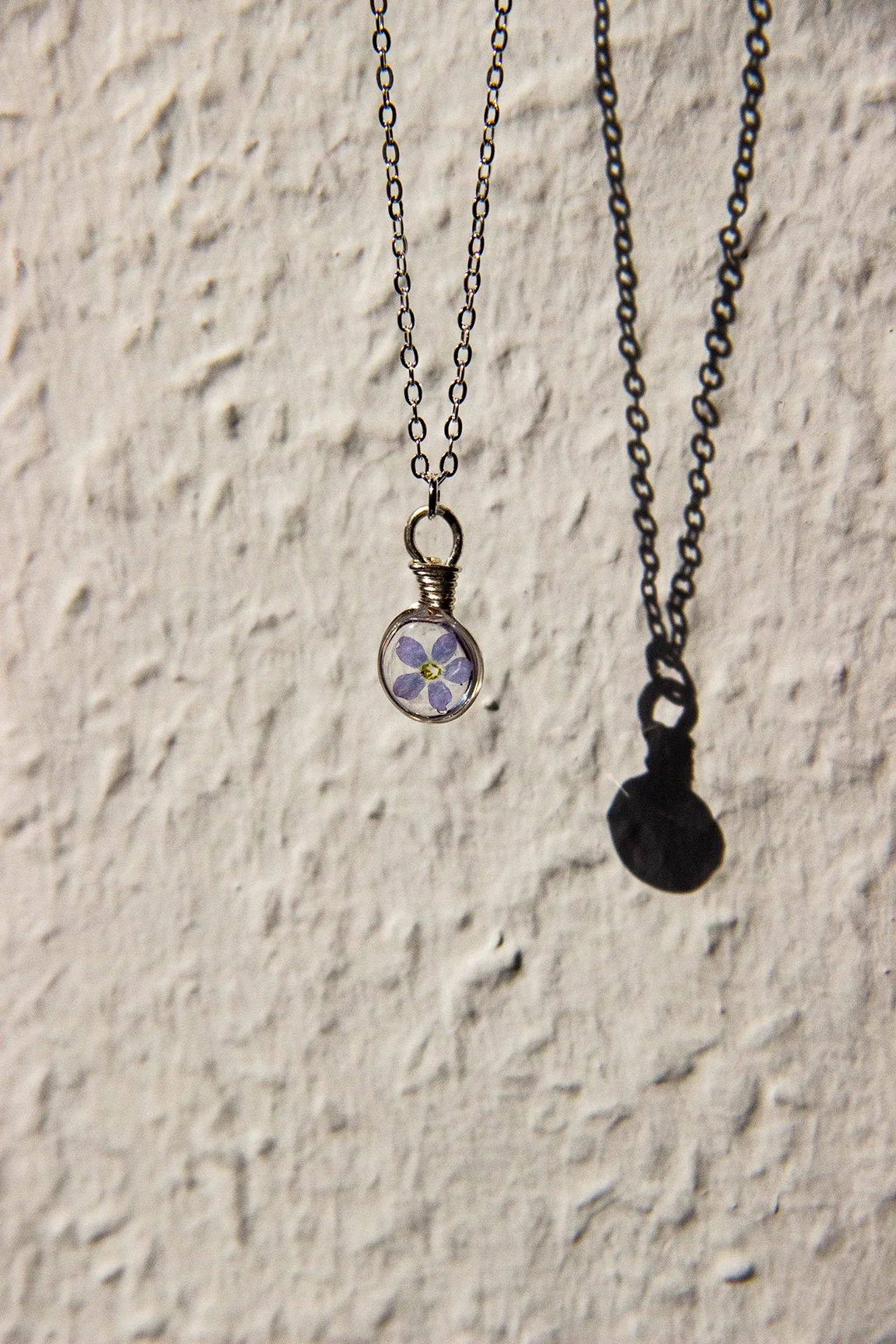 Dieser Anhänger wird aus versilbertem Kupferdraht Hand gebogen und sorgfältig mit Kunstharz ausgegossen, bevor die winzigen Blüten darin eingelassen werden.