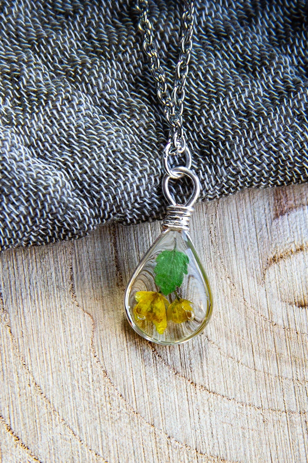Dieser Anhänger wird aus versilbertem Kupferdraht Hand gebogen und sorgfältig mit Kunstharz ausgegossen, bevor die winzigen Blüten darin eingelassen werden.